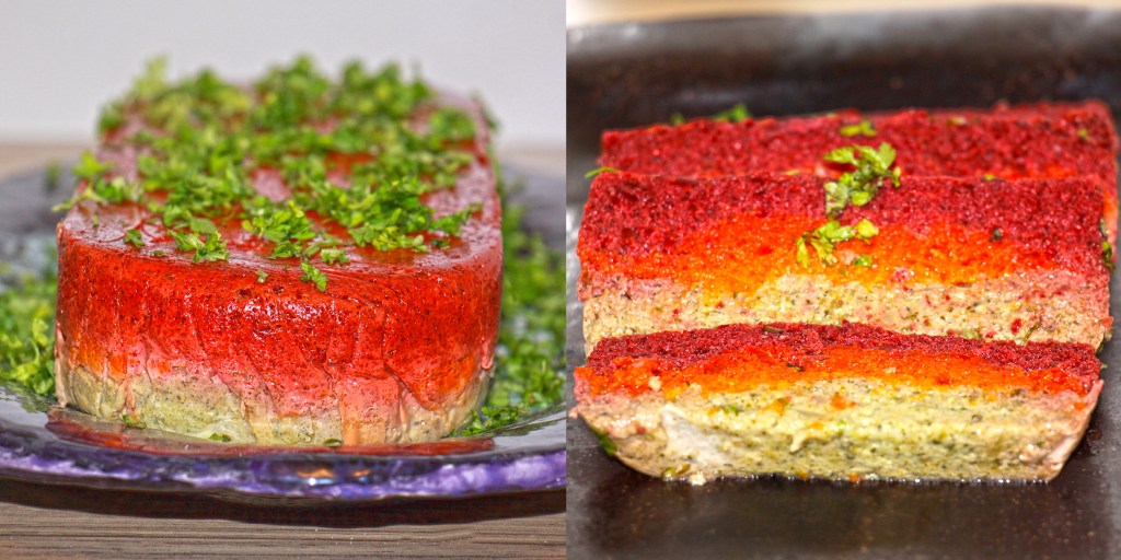 Eine große Terrinen oder Kastenform mit Frischhaltefolie auslegen und zunächst das Rote Bete-Püree einfüllen und glattstreichen – dann vorsichtig das Möhrenpüree sowie danach das Brokkoli-Püree darauf verteilen (ohne Druck). Die Form in ein Wasserbad (z.B. im tiefen Backblech) stellen und die Pastete im Ofen 1 1/2 Stunden bei 120° stocken und vor dem Stürzen mindestens 2 Stunden kalt stellen.