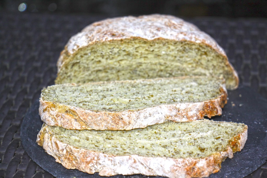 400g Kartoffeln schälen, würfeln und ca. 15 Min. in Salzwasser weich kochen – 350 ml vom Kochwasser aufheben. Die kalten Kartoffeln stampfen. 2 Würfel frische Hefe in einer Schüssel mit dem Kartoffelwasser glatt rühren. 600 Dinkelmehl, 1 Paket grüne-Soße Kräuter (ca.200g Schnittlauch, Petersilie, Kerbel, Pimpinelle, Borretsch, Kresse und Sauerampfer ) sowie die gestampften Kartoffeln zugeben. Alles zu einem glatten Brotteig kneten. Mindestens 2 Stunden gehen lassen. Einen Laib aufs Backblech formen nochmals 15 Min gehen lassen und dann bei 200° ca. 45 Minuten backen.