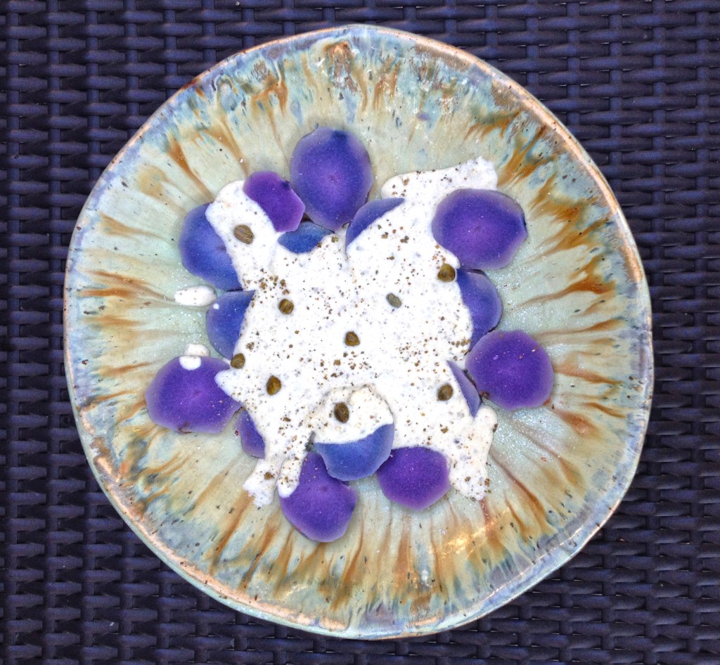 200g (Soja-)Joghurt, 200g Artischocken, 1 kleines Glas Kapern, 1 EL scharfer Senf pürieren. 2 Große violette Kartoffeln (Vitelotte) kochen (nicht zu weich) in Scheiben schneiden auf eine Platte legen mit Meersalz würzen die Soße darübergeben und mit frisch gemörsertem grünen Pfeffer und ein paar Kapern garnieren. Das ist für 2 Personen ein kleines Abendessen oder für 4 eine Vorspeise. Wir lieben dieses Gericht sowohl vegan mit Soja-Joghurt als auch vegetarisch mit Volfettem (10%) Joghurt.