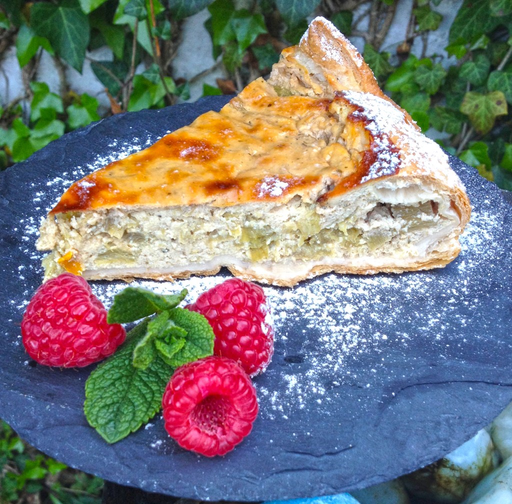 800g Rhabarber schälen und in ca. 2 cm große Würfel schneiden. Mit 2 EL Zucker und 1 Likörglas Erdbeersirup kurz erhitzen das der Zucker flüssig wird dann sofort vom Herd nehmen und schnell abkühlen. Mit 400g Frischkäse und 6 Eiern gut vermischen. Mit etwas Gehackter Minze und Zitronenschalenabrieb würzen. Eine Springform mit Blätterteig auslegen, die Masse einfüllen und bei 180° ca 50 Minuten backen.