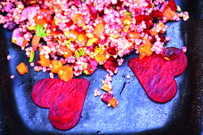 Bunter Hirsesalat: 1 rote Bete klein würfeln und in 1 EL Olivenöl und dem Saft 1/2 Zitrone marinieren. Dann 2 große Möhren und 1 Kohlrabi ebenfalls fein würfeln sowie 1 Bund gemischte Kräuter (z.B. Kerbel, Petersilie, Thymian) hacken. 250g Hirse zubereiten mit dem Gemüse mischen, Mit Salz, Pfeffer und Zitrone abschmecken.
