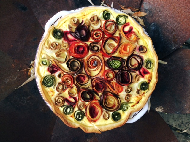 1 schmale Auberginen, 1 kleine Zucchini, 2 bunte Möhren und rote Spitzpaprika in dünne schmale Scheiben schneiden. Gemüsescheiben abwechselnd fest zusammen aufrollen. Den Boden einer Tarte- Form (flache runde Form) dünn mit Teig bedecken. 2 Eier mit 150g Ziegenfrischkäse verquirlen mit Knoblauch, Salz und Pfeffer würzen auf den Teig geben und die „Blumen hineindrücken“. und im 180° heißen Backofen ca. 25 Minuten garen.