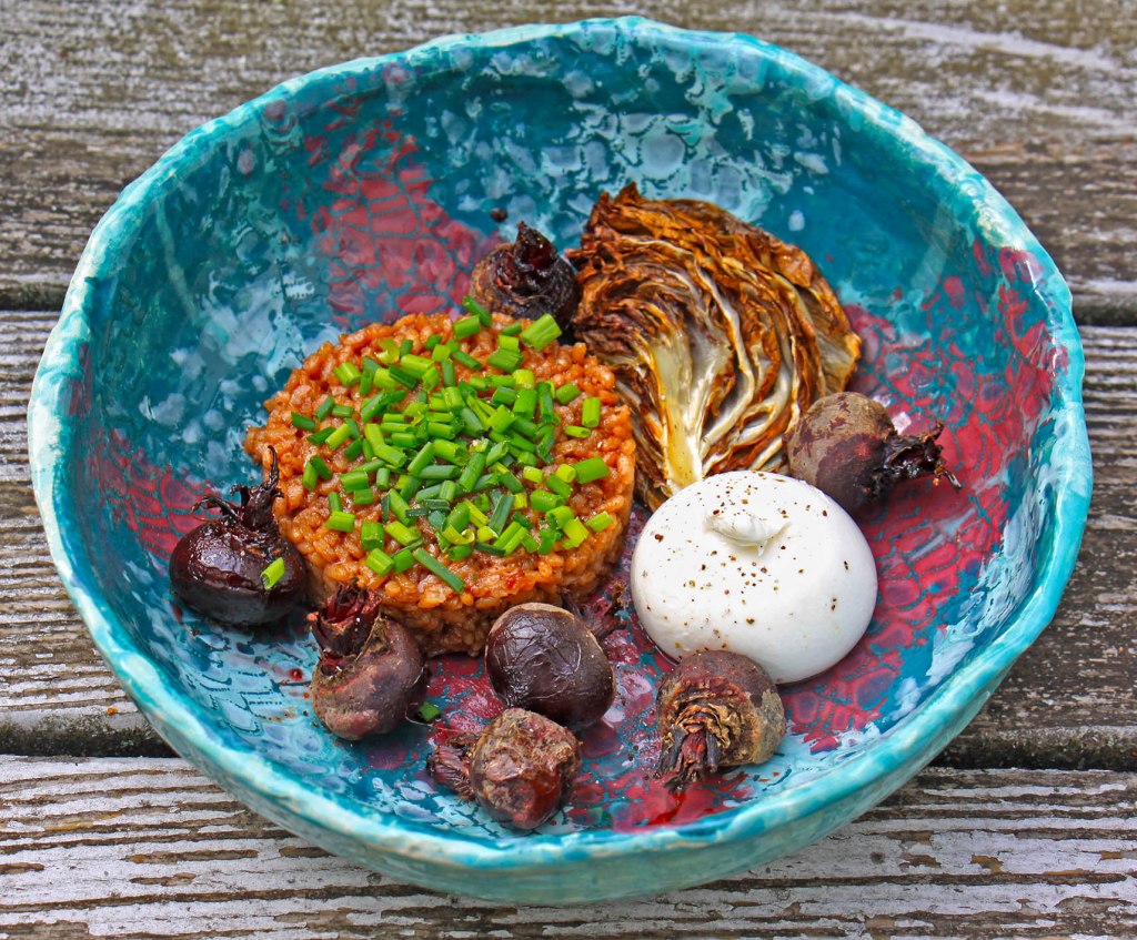 Für 2 Reis-Hungrige: Den Backofen auf 200° vorheizen. 1 Radicchio vierteln und einige sehr kleine Rote Bete gründlich waschen. Das Gemüse in eine ofenfeste Form geben, den Radicchio mit je 1 EL Honig bestreichen und über die Bete 1 TL Meersalz geben. Nun das Gemüse im Ofen ca. 15 Minuten bräunen. 1 Tasse Risotto-Reis in 1 EL Öl anschwitzen und mit 1 Tasse kräftigem Rotwein (alternativ Rote Bete-Saft) ablöschen, nach und nach unter mehrmaligem Rühren noch weitere 2 Tassen Gemüsebrühe dazu geben. Den Reis immer wieder vom Topfboden schaben bis er weich aber noch bissfest ist – falls er zu trocken wird, noch weitere Flüssigkeit zugeben (Rotwein oder Gemüsebrühe). Den Reis mit dem Gemüse und einer kleinen Burrata pro Person anrichten und vernaschen.